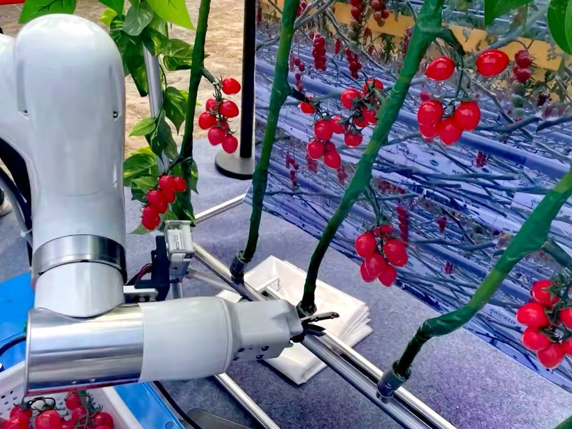 在展区内,记者看到多项“AI+农业”硬核科技产品集中亮相,具体有草莓采摘机器人、番茄采摘机器人、农产品智能无损检测装备等。北京市农林科学院智能装备技术研究中心研究员熊亚向新京报记者介绍,草莓采摘机器人专为高空无土栽培模式设计,适用于以麦麸、秸秆粉碎等基质替代土壤的立体种植系统。该机器人采用自研双臂协同结构,可在垄下移动,通过抬高机械臂实现对上方果实的精准采摘。其核心在于末端执行器——一种采用硅胶材质的柔性“吞咽式”手爪,能模拟人手弯折动作,在采摘时几乎不损伤果实。